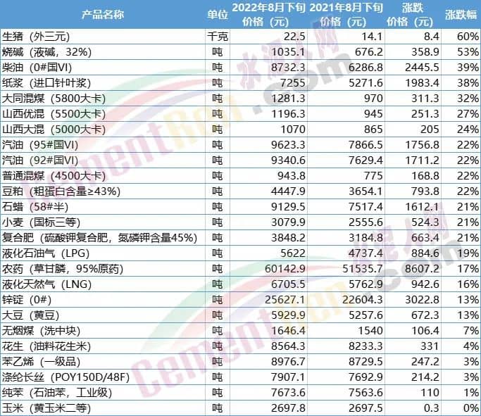 国家统计局近期公布的2022年8月下旬流通领域重要生产资料市场价格变动情况显示,全国流通领域9大类50种重要生产资料市场价格的监测显示,2022年8月下旬与8月中旬相比,25种产品价格上涨。同比上年同期生猪、烧碱、柴油、纸浆、煤炭、汽油、豆粕、石蜡、复合肥、小麦等14种产品价格涨幅超过20%,其中生猪价格上涨了60%,柴油(0#国VI)上涨了39%,纸浆(进口针叶浆)上涨38%,大同混煤(5800大卡)上涨了32%。