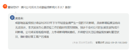家居企业富森美表示,成都地区疫情预计将会对2022年下半年经营业绩产生一定的不利影响,具体影响程度目前尚无法预计。本次居家办公是防疫工作的临时性管控措施,预计不会对公司的长期发展构成不利影响。公司将采取相应举措,力争将影响降到最低,并将密切关注后续疫情发展和管控状况,随时做好复工复产的准备。