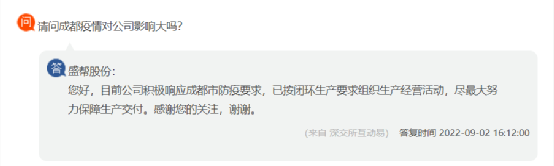盛帮股份回复,目前公司积极响应成都市防疫要求,已按闭环生产要求组织生产经营活动,尽最大努力保障生产交付。