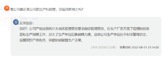 盐湖股份回复:公司严格按照格尔木地区疫情管控要求做好疫情管控,在生产厂区开展了疫情防控排查和生产保障工作,加大了生产单位后勤保障力度。目前公司生产单位处于封闭管理状态,疫情管控严格有序,钾肥和碳酸锂生产正常。