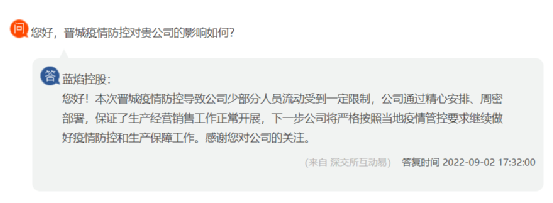 山西晋城蓝焰控股回复本次晋城疫情防控导致公司少部分人员流动受到一定限制,公司通过精心安排、周密部署,保证了生产经营销售工作正常开展,下一步公司将严格按照当地疫情管控要求继续做好疫情防控和生产保障工作。