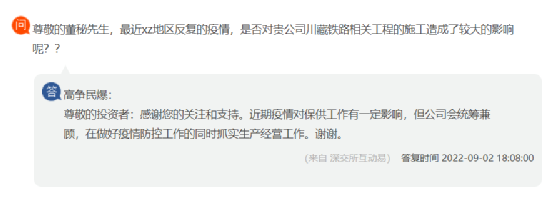 西藏高争民爆针对投资者提出的西藏地区反复的疫情是否川藏铁路相关工程施工造成较大影响回复称,近期疫情对保供工作有一定影响,但公司会统筹兼顾,在做好疫情防控工作的同时抓实生产经营工作。