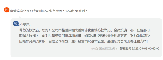 深圳从事轨道交通产品研发、生产、销售的科安达回复公司严格落实和完善常态化疫情防控举措,全员抗疫一心,在各部门的通力协作下,面对疫情带来的挑战和困难,动态适时调整经营计划与方式,努力争取减少因疫情带来的影响,目前公司研发、生产经营情况基本正常。