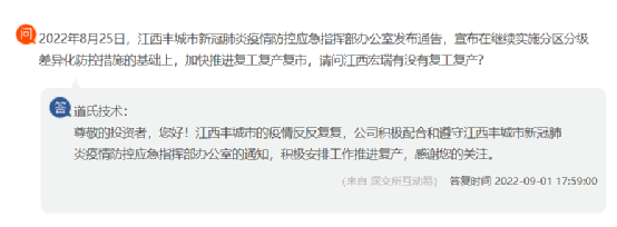 江西道氏技术回复投资者称,江西丰城市的疫情反反复复,公司积极配合和遵守江西丰城市新冠肺炎疫情防控应急指挥部办公室的通知,积极安排工作推进复产。