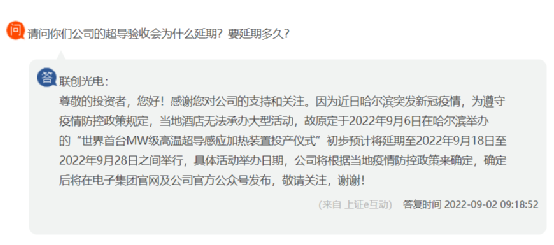 联创光电回复,因为近日哈尔滨突发新冠疫情,为遵守疫情防控政策规定,当地酒店无法承办大型活动,故原定于2022年9月6日在哈尔滨举办的“世界首台MW级高温超导感应加热装置投产仪式”初步预计将延期至2022年9月18日至2022年9月28日之间举行,具体活动举办日期,公司将根据当地疫情防控政策来确定。