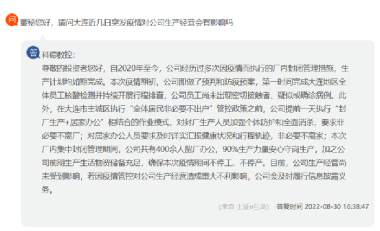 科德数控回复称,本次疫情期初,公司即做了预判和防疫预案,第一时间完成大连地区全体员工核酸检测并持续开展行程排查,公司员工尚未出现密切接触者、疑似或确诊病例。此外,在大连市主城区执行“全体居民非必要不出户”管控政策之前,公司提前一天执行“封厂生产+居家办公”相结合的作业模式,对封厂生产人员加强个体防护和全面消杀,要求非必要不离厂;对居家办公人员要求及时详实汇报健康状况和行程轨迹,非必要不离家;本次厂内集中封闭管理期间,公司共有400余人留厂办公,90%生产力量安心守岗生产,加之公司前期生产生活物资储备充足,确保本次疫情期间不停工、不停产。目前,公司生产经营尚未受到影响。