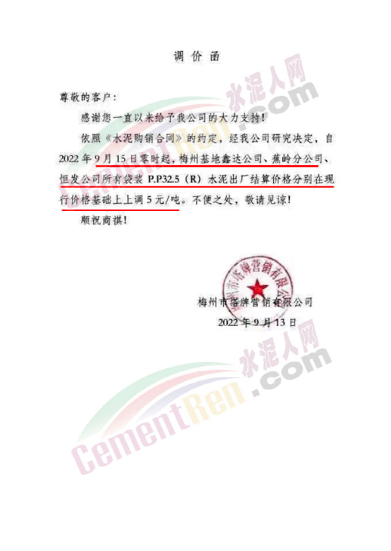 水泥人网通讯员消息:广东梅州市塔牌营销有限公司通知,自9月15日零时起,梅州基地鑫达公司、蕉岭分公司、恒发公司所有袋装P.P32.5(R)水泥出厂结算价格分别在现行基础上上调5元/吨。