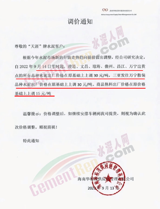 海南华昌茂供应链管理有限公司、海南华裕茂供应链管理有限公司通知,根据今年水泥市场新的行情走势趋向提前做出调整,经公司研究决定,自2022年9月14日零时起,澄迈、文昌、琼海、儋州、昌江、万宁出货点的所有品种水泥出厂价格在原基础上上调30元/吨,三亚发往万宁散装品种水泥出厂价格在原基础上上调30元/吨。商品熟料出厂价格在原价格基础上上调15元/吨。