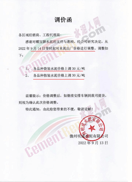 儋州明成水泥有限公司通知,自9月14日零时起对水泥出厂价格上调30元/吨。价格调整后,如继续安排车辆到公司提货,则视为确认此次价格调整。