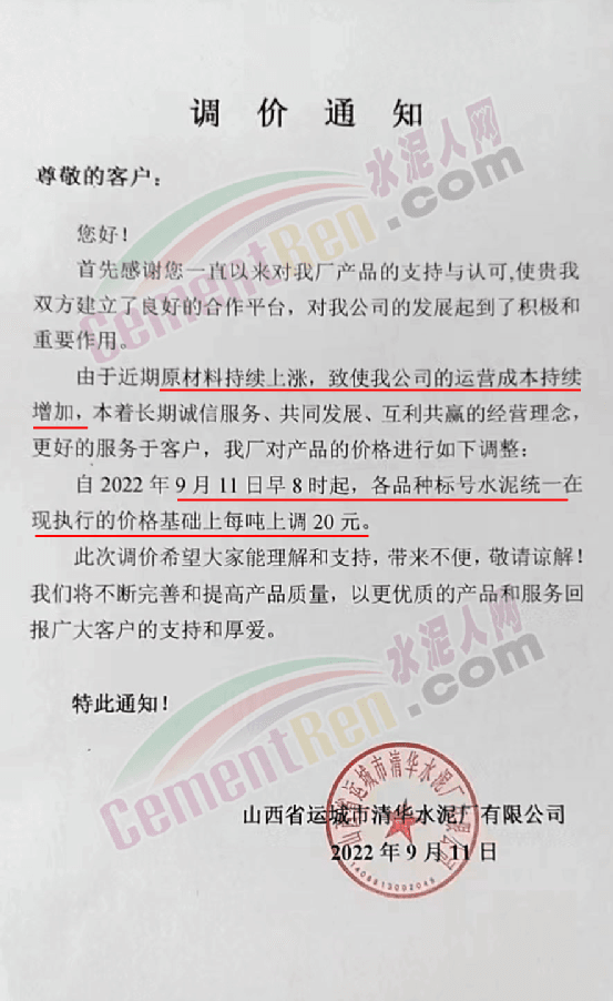 山西运城市清华水泥通知,由于近期原材料持续上涨,致使公司运营成本持续增加,自9月11日早8时起,各品种标号水泥统一在现执行价格基础上上调20元/吨。