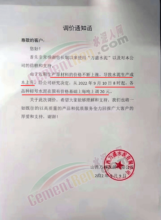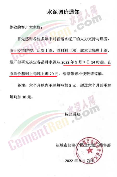 运城市盐湖区晋运水泥销售部通知,由于疫情防控、运费上涨、原材料上涨、成本大幅度上涨,从9月7日14时起,在原价基础上上调20元/吨。