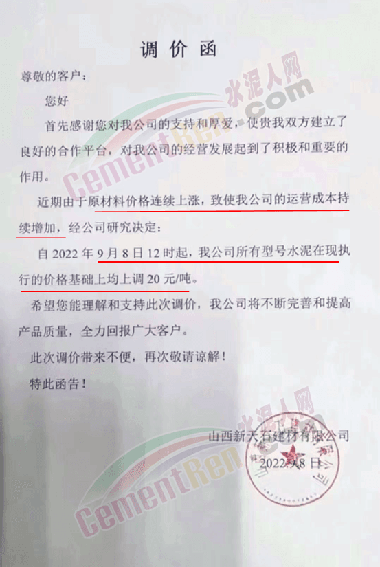 山西新天石建材有限公司通知,由于原材料价格连续上涨,致使公司运营成本持续增加,自9月8日12时起,公司所有型号水泥在现执行价格基础上上调20元/吨。