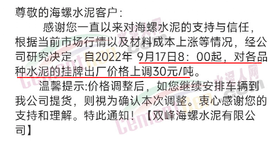 双峰海螺水泥有限公司通知,根据当前市场行情以及材料成本上涨等情况,经公司研究决定,自2022年9月17日800起,对各品种水泥的挂牌出厂价格上调30元/吨。