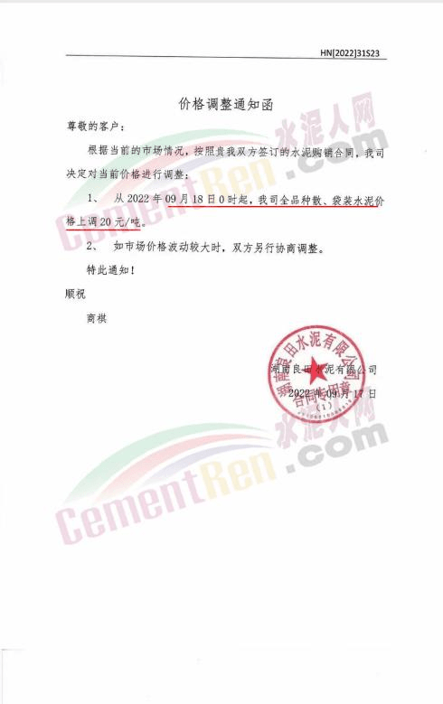 华润水泥旗下湖南良田水泥有限公司通知,9月18日0时起,公司全品种散装、袋装水泥价格上调20元/吨。