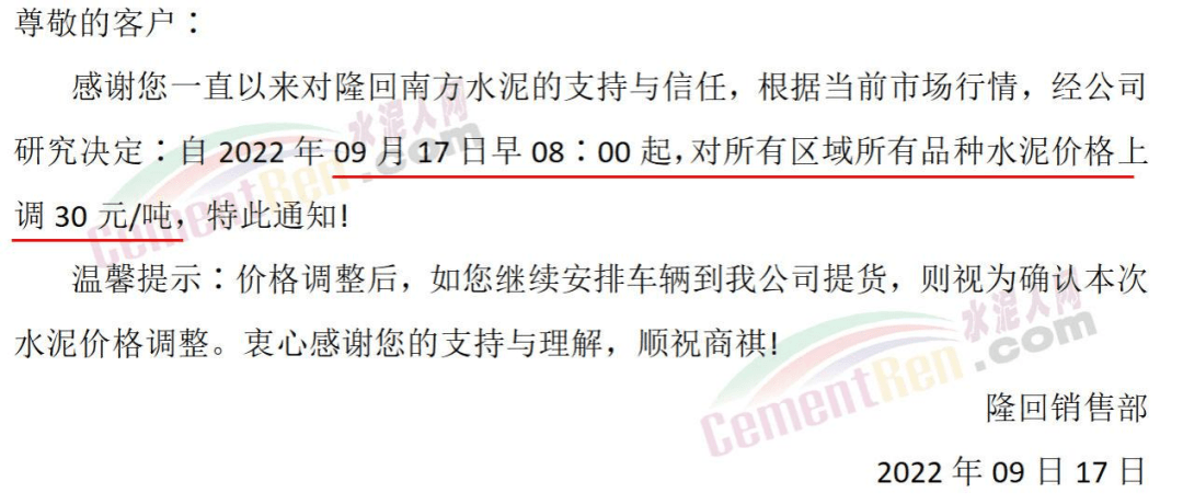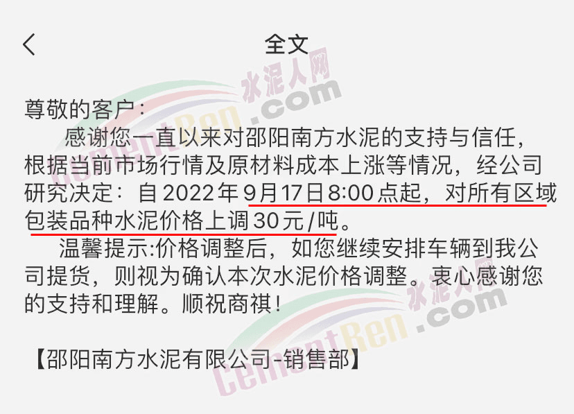 邵阳南方水泥有限公司销售部通知,自9月17日早8时起,对所有区域所有品种水泥价格上调30元/吨。
