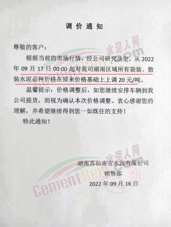湖南苏仙南方通知,自9月17日0时起对湖南区域所有袋装、散装水泥价格上调20元/吨。