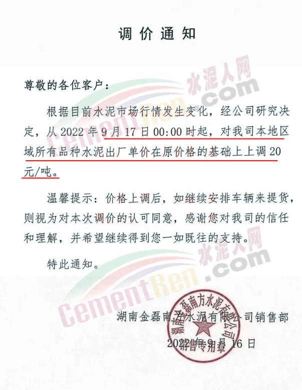 湖南金磊南方水泥有限公司销售部通知,自9月17日0时起,对公司本地区域所有品种水泥出厂价上调20元/吨。