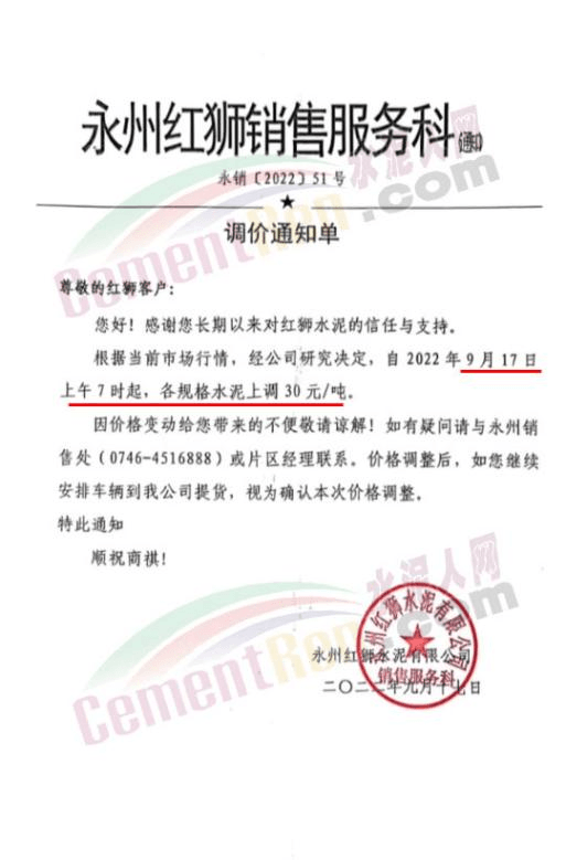 永州红狮水泥有限公司通知,自9月17日上午7时起,各规格水泥上调30元/吨。
