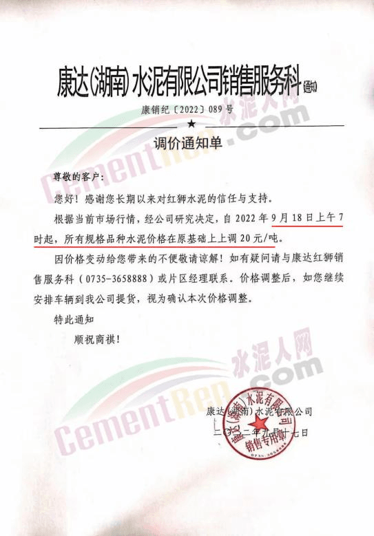 红狮水泥旗下康达(湖南)水泥有限公司销售服务科通知自9月18日上午7时起,所有规格品种水泥价格在原基础上上调20元/吨。