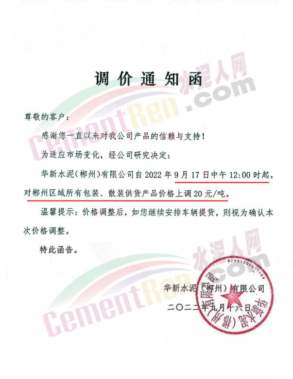 华新水泥(郴州)有限公司通知,自9月17日中午12时起对郴州区域所有包装、散装供货产品价格上调20元/吨。