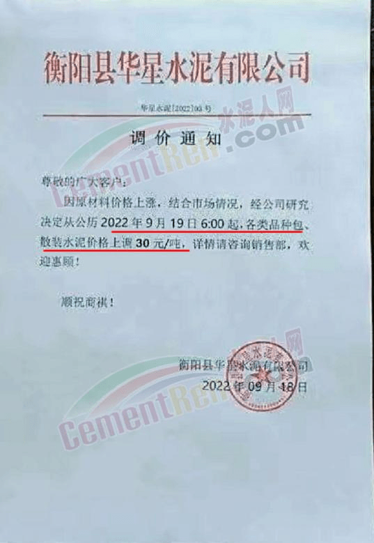 湖南衡阳县华星水泥有限公司通知,自9月19日6时起,各类品种包散装水泥价格上调30元/吨。