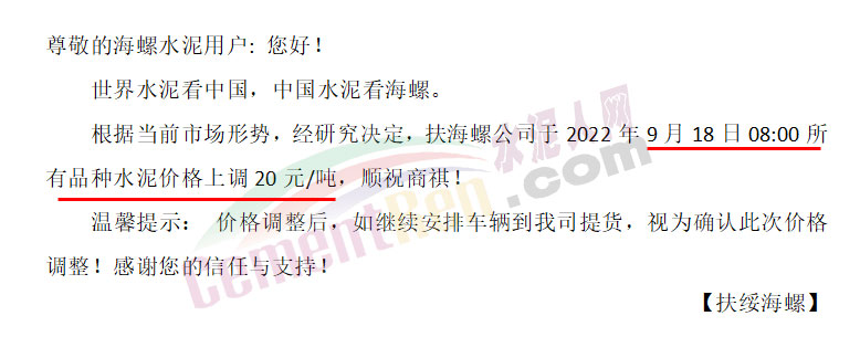 广西扶绥海螺通知9月18日8时起所有品种水泥价格上调20元/吨。