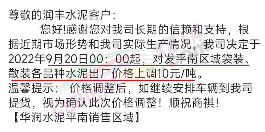 广西贵港华润平南水泥有限公司通知9月20日0时起,对发平南区域袋装、散装各品种水泥出厂价上调10元/吨。