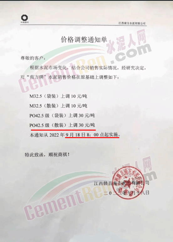 江西赣县南方水泥有限公司通知自9月18号8点起南方32.5水泥上调10元/吨,42.5水泥上调30元/吨。