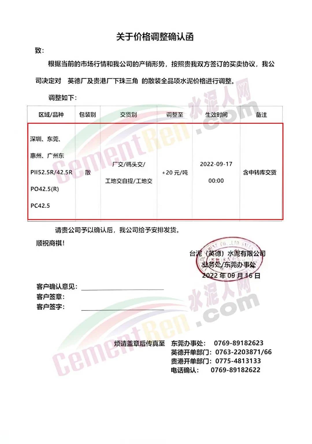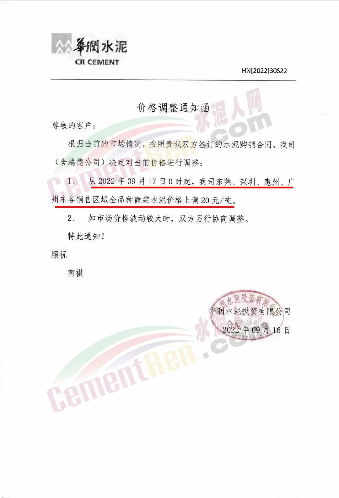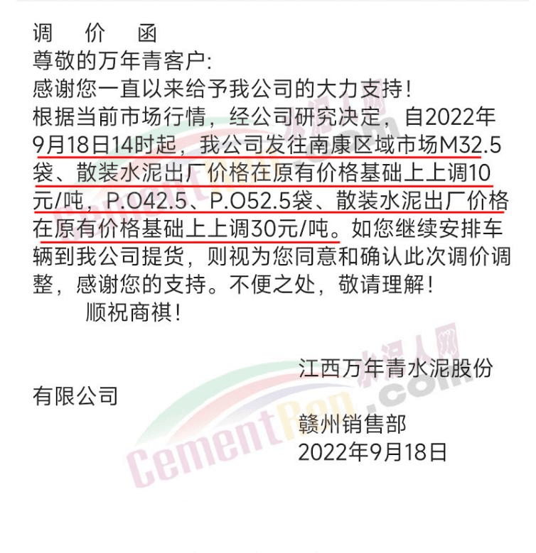 江西万年青水泥股份有限公司赣州销售部通知根据当前市场行情,经公司研究决定,自9月18日14时起,公司发往南康区域市场M32.5 袋、散装水泥出厂价格在原有价格基础上上调10 元/吨,P.042.5、P.052.5袋、散装水泥出厂价格在原有价格基础上上调30元/吨。