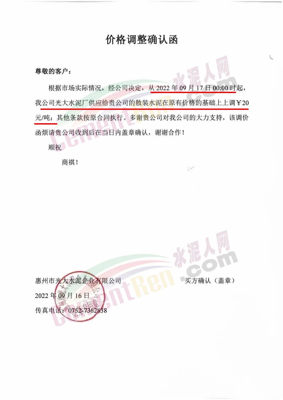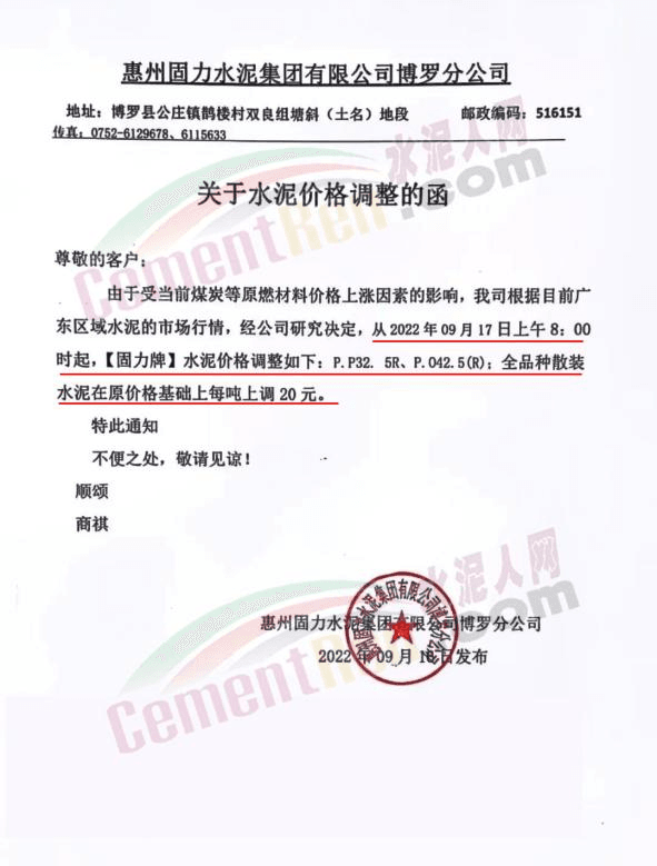 广东华润、塔牌、台泥、光大、罗浮山等企业调涨20元/吨
