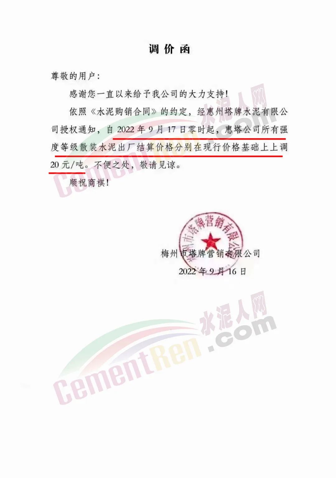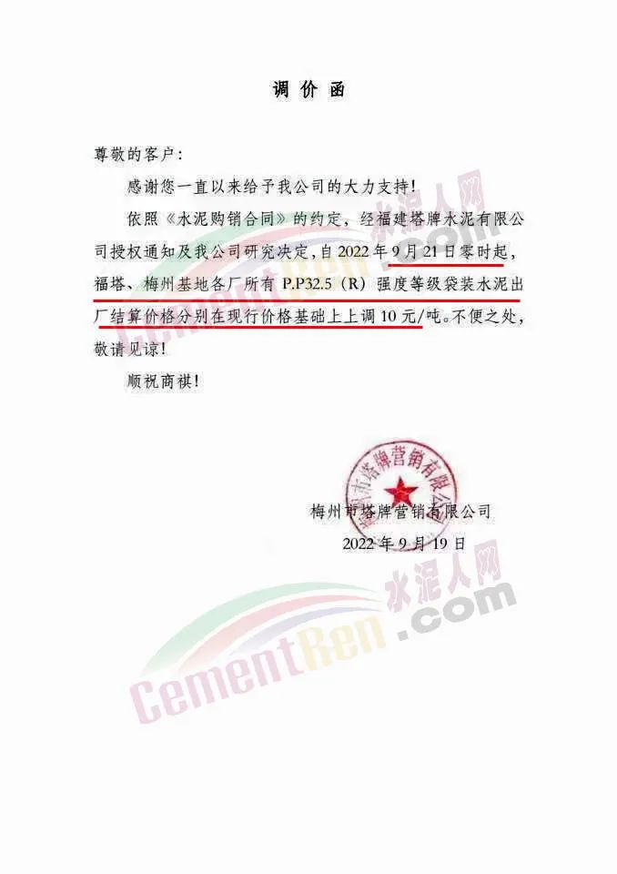 梅州市塔牌营销有限公司通知,经福建塔牌水泥有限公司授权通知及公司研究决定,自9月21日零时起,福塔、梅州基地各厂所有P.P32.5(R)强度等级袋装水泥出厂结算价格分别在现行价格基础上上调10元/吨。