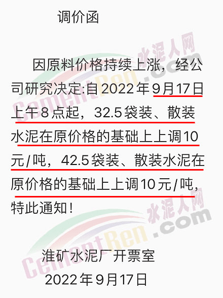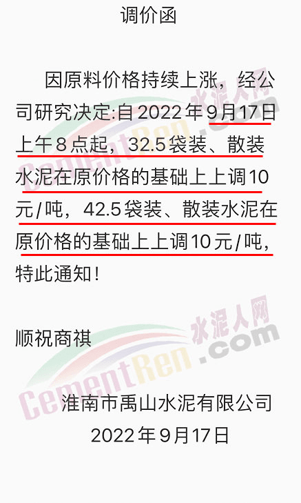 淮南市禹山水泥有限公司通知因原料价格持续上涨,经公司研究决定∶自9月17日上午8点起,32.5袋装、散装水泥在原价格的基础上上调10 元/吨,42.5袋装、散装水泥在原价格的基础上上调10元/吨。
