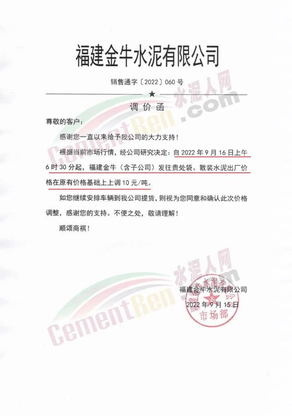 福建金牛水泥通知9月16日上午6时30分起上调水泥价格10元/吨。