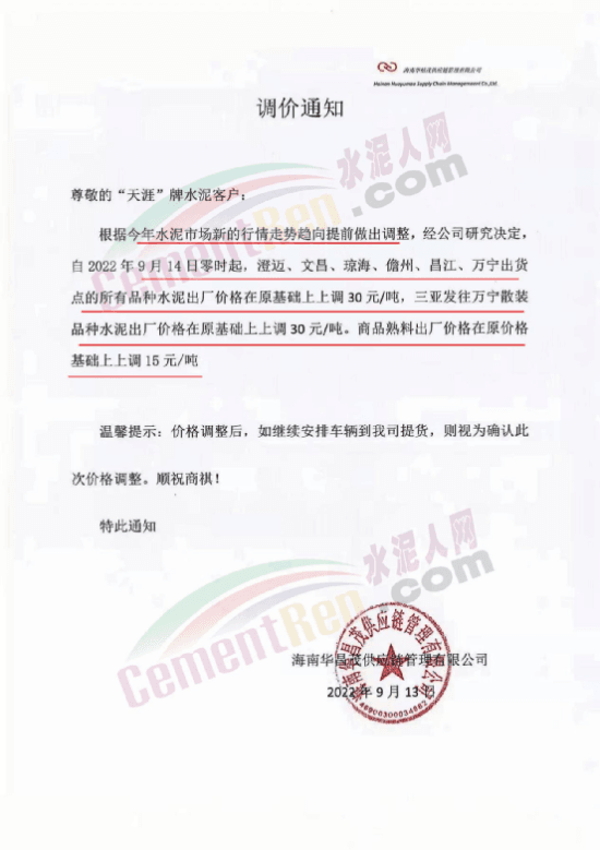 海南华昌茂供应链管理有限公司、海南华裕茂供应链管理有限公司通知,根据今年水泥市场新的行情走势趋向提前做出调整,经公司研究决定,自2022年9月14日零时起,澄迈、文昌、琼海、儋州、昌江、万宁出货点的所有品种水泥出厂价格在原基础上上调30元/吨,三亚发往万宁散装品种水泥出厂价格在原基础上上调30元/吨。商品熟料出厂价格在原价格基础上上调15元/吨。