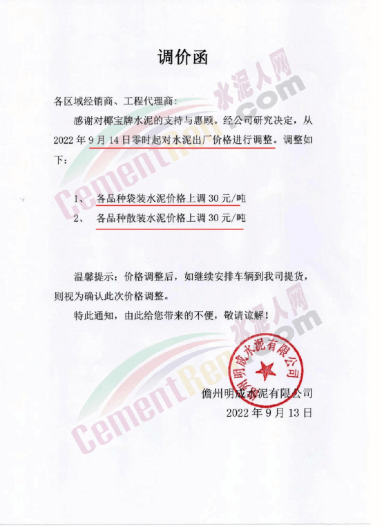 儋州明成水泥有限公司通知,自9月14日零时起对水泥出厂价格上调30元/吨。