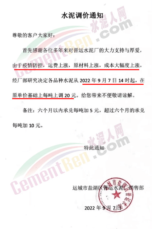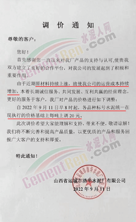 由于近期原材料持续上涨,致使公司运营成本持续增加,10日前后,山西运城区域部分企业通知上调水泥价格20-30元/吨。
