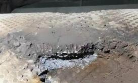 2、辊套母体表层崩损,辊压机系统运行中使用除铁装置已成标配,不可否认的是部分企业在生产运行中该设备形同摆设也是存在的,而系统中进入不吸磁铁件也为常事,因辊套母体为锻造而成,整体强度稍显不足,很容易在进入铁体时将母材表层崩损,如不及时修复短时间内会使崩损点像堆焊辊套那样造成往深处磨损及周边扩展的问题发生。
