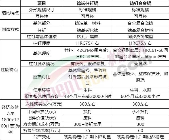 镶嵌式柱钉辊与铸钉辊数据对比: