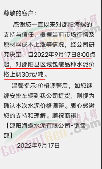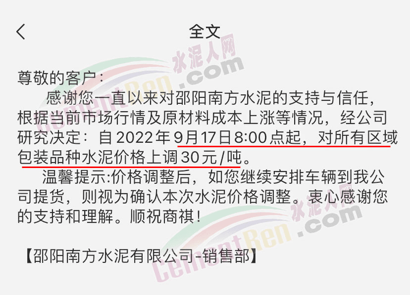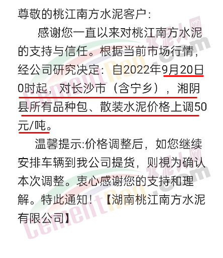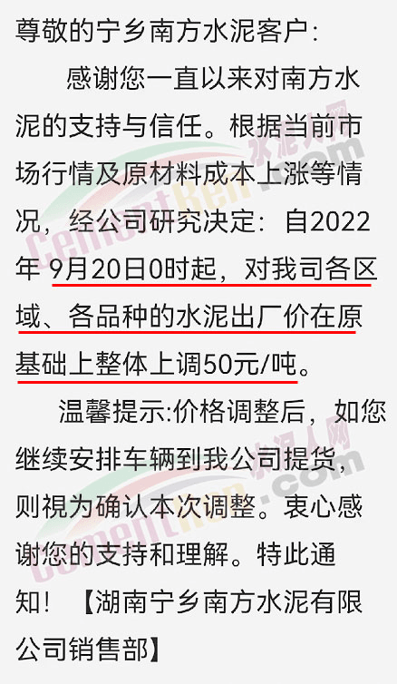 湖南宁乡南方水泥有限公司销售部通知根据当前市场行情及原材料成本上涨等情况,经公司研究决定自2022 年9月20日0时起,对各区域、各品种的水泥出厂价在原基础上整体上调50元/吨。