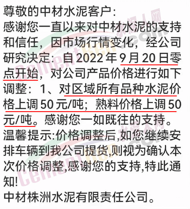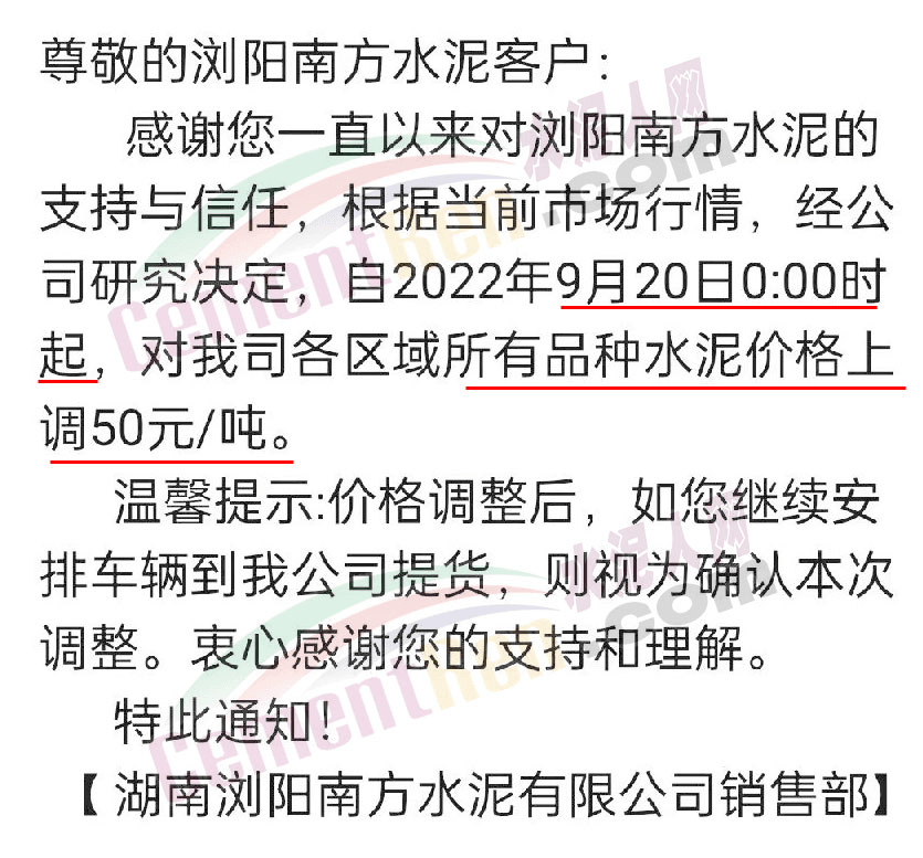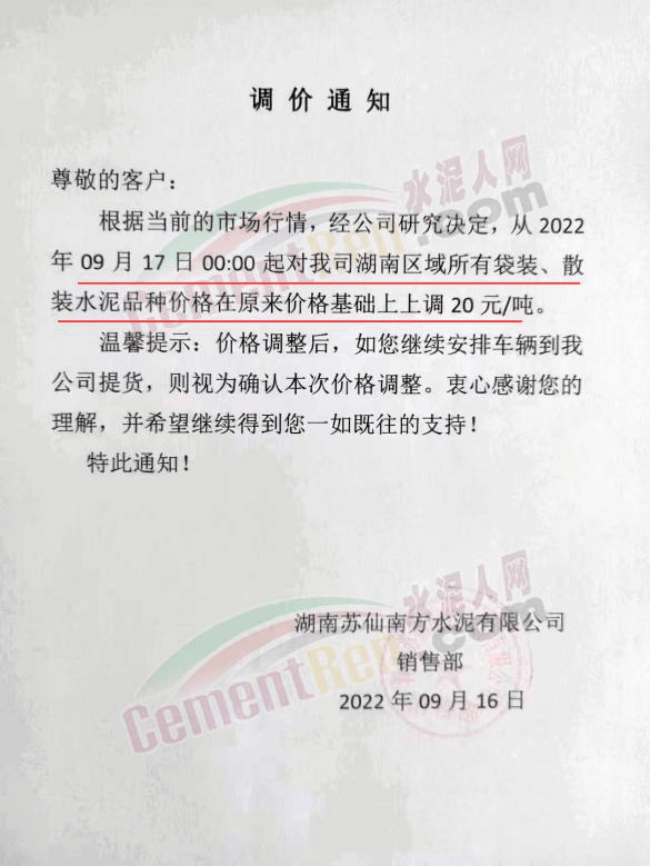 湖南浏阳南方水泥有限公司销售部通知根据当前市场行情,经公司研究决定,自2022年9月20日0时起,对各区域所有品种水泥价格上调50元/吨。