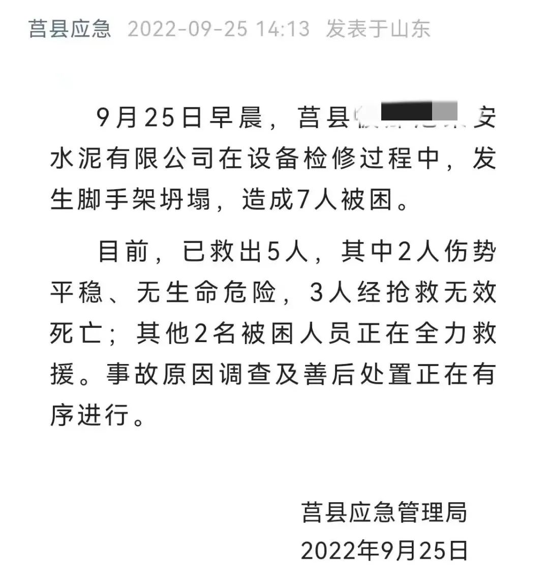 9月25日,莒县应急官微发布消息,莒县某安水泥有限公司在设备检修过程中,发生脚手架坍塌,造成7人被困。