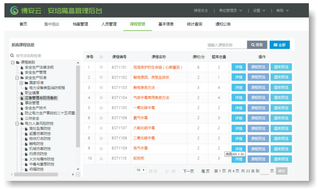 安培魔盒附带一个专属安全培训管理后台,企业可使用后台进行人员实名制管理、课程管理、培训方案自定义管理、培训档案管理、培训数据监管等全方位信息化管理,全面高效。