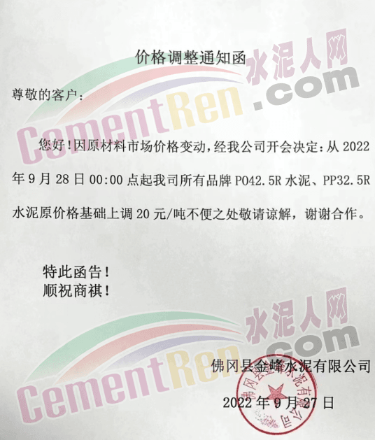 佛冈县金峰水泥有限公司发布通知称:因原材料市场价格变动,从2022年9月28日00:00起,我司所有品牌PO42.5R水泥、PP32.5R水泥原价格基础上上调20元/吨。