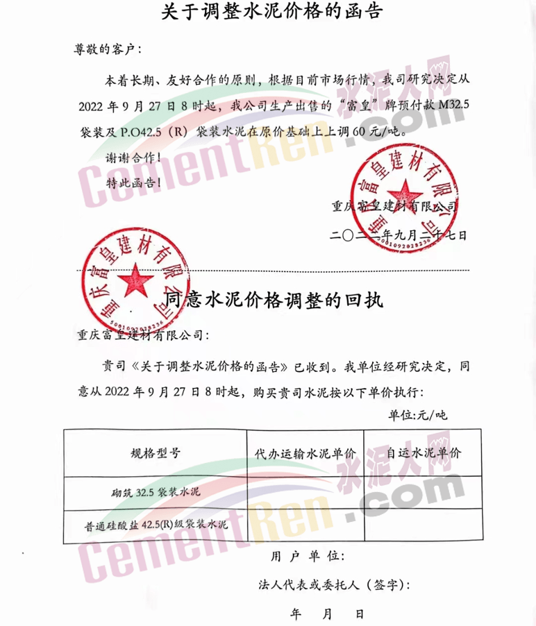 重庆富皇建材有限公司发布通知称:根据目前市场行情,我司研究决定从2022年9月27日8时起,我公司生产出售的“富皇”牌预付款M32.5袋装及P.O42.5R袋装水泥在原价基础上上调60元/吨。