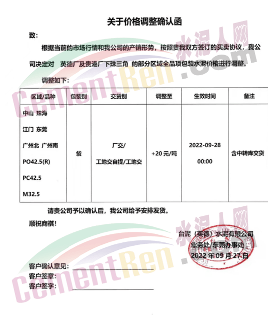 台泥(英德)水泥有限公司发布通知称:自2022年9月28日0时起,销往中山、珠海、江门、东莞、广州北、广州南PO42.5R、PC42.5、M32.5袋装水泥价格上调20元/吨。