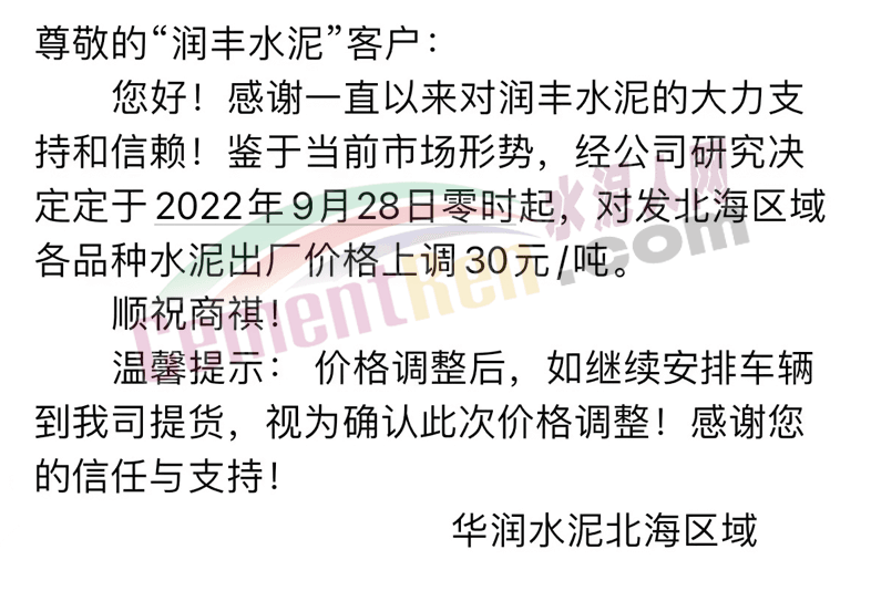 华润水泥北海区域发布通知称:自2022年9月28日零时起,对发北海区域各品种水泥出厂价格上调30元/吨。