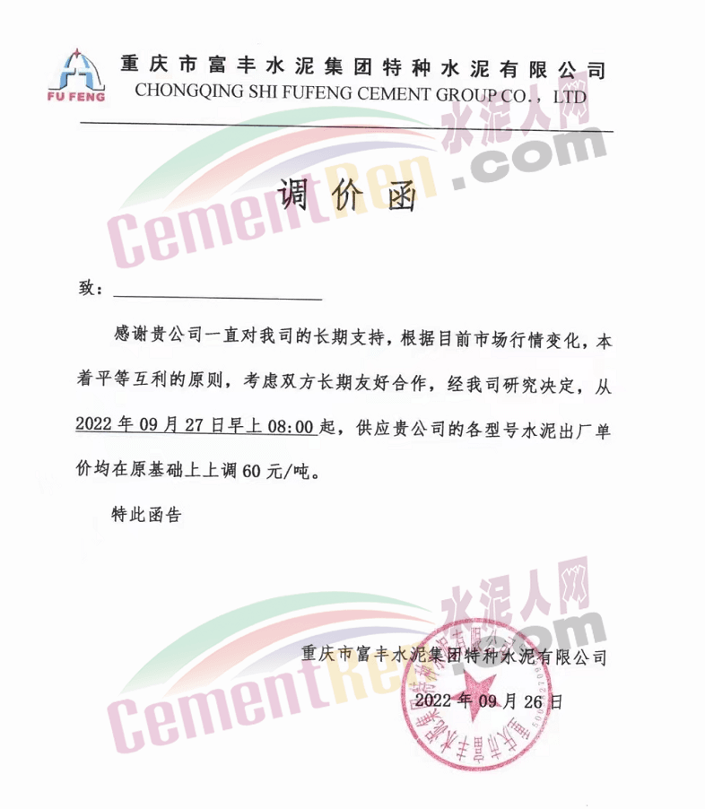 重庆市富丰水泥集团特种水泥有限公司发布通知称:根据目前市场行情变化,经我司研究决定,从2022年9月27日早上8:00起,供应贵公司各型号水泥出厂价格在原基础上上调60元/吨。