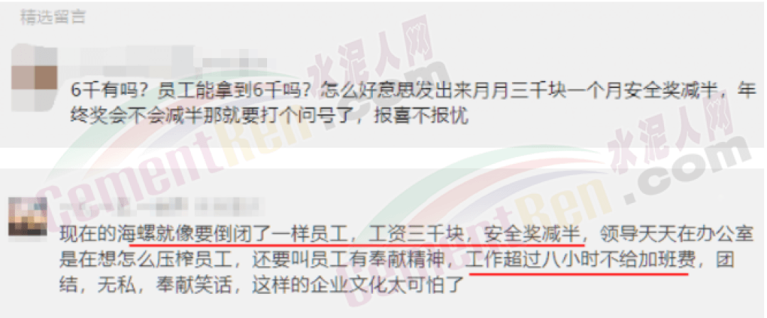 另据水泥人网通讯员消息,近来海螺水泥将员工安全奖减半,同时因绩效评分下降,员工工资也基本降至原来的八折水平。且有通知称,若企业出现亏损,年金也将取消。有网友留言说,“到手三千块,一个月安全奖减半,年终奖会不会减半要打个问号了。”