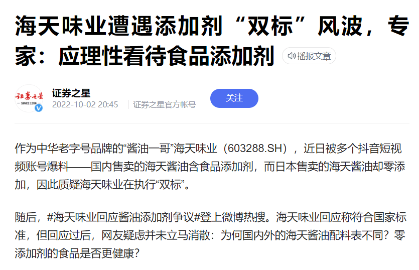 随着“海克斯科技”视频博主辛吉飞的持续爆料,越来越多的产品出现在观众眼前。辛吉飞拍了一个制作勾兑酱油的方法,虽然没指名道姓,但大家还是联想到了“酱油一哥”海天味业。此后,多个抖音短视频账号爆料——国内售卖的海天酱油含食品添加剂,而日本售卖的海天酱油却零添加,因此质疑海天味业在执行“双标”。