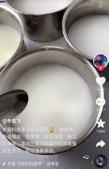 自己制作的羊杂汤之所以是奶白色,需要用牛骨炖煮很长时间,结果该博主直接在清水中加入“一勺三花淡奶”就调制出了浓稠奶白色的汤。一时间,“师傅熬高汤七个小时,我一勺三花淡奶加鸡精顾客直呼童年味道”的说法火遍全网。